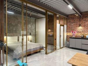 шторой, функциональную кухню-гостиную и большую ванную комнату с