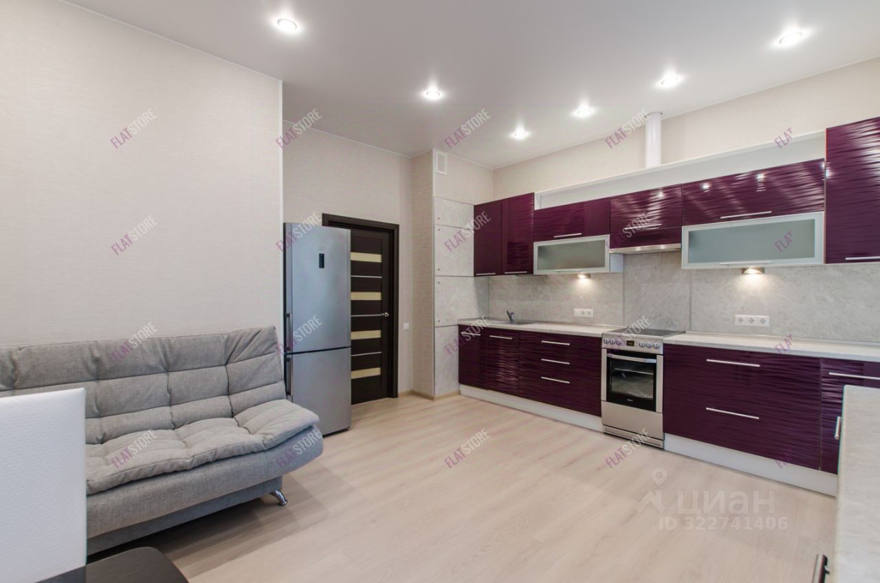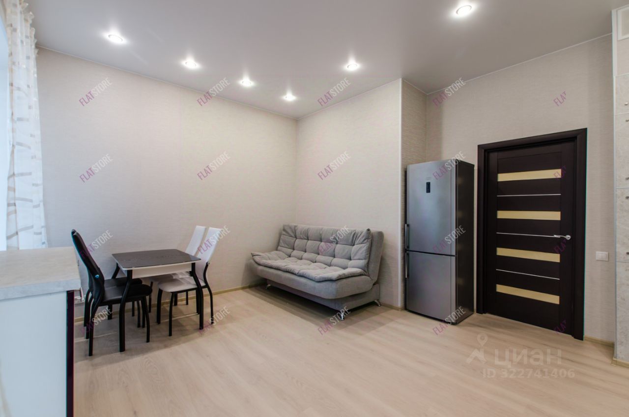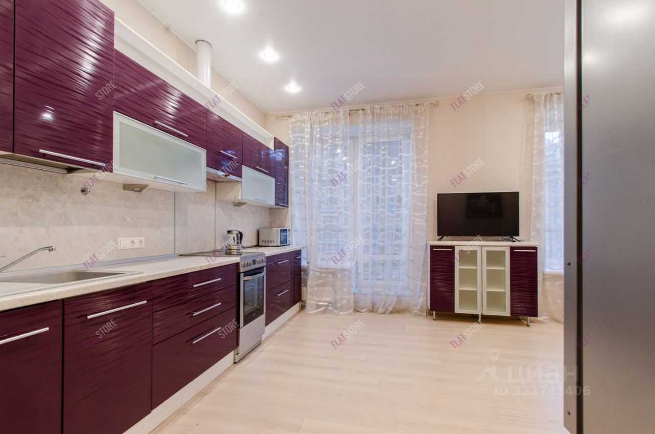 Кухня-гостиная со встроенной кухонной мебелью. Есть посудомоечная машина, электрическая плита с духовкой, вытяжка, холодильник. На консоли установлен телевизор. Удобный раскладной диван, стол и стулья.