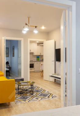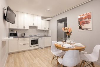 - Полноценная кухня (газовая плита, стиральная и посудомоечная машины, холодильник, СВЧ-печь, электрический чайник).