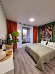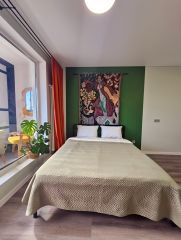 * Спальная зона: кровать с ортопедическим матрасом, двумя тумбочками и винтажным панно-гобеленом. Вместительный комод. Телевизор (в процессе монтажа). Кофейный столик.