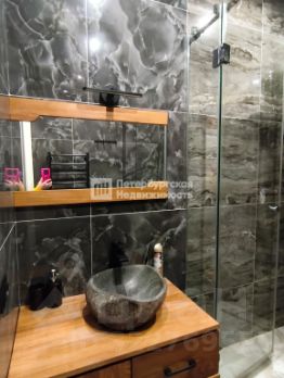 В квартире сделан дизайнерский ремонт: в комнате просторная гардеробная, электрокамин, двуспальный диван фирмы Аскона с ортопедическим матрасом, телевизор. Встроенная кухня оснащена посудомоечной машиной, холодильником, духовым шкафом, микроволновкой, стиральной машиной, вытяжкой. Выход на просторный балкон из кухни.