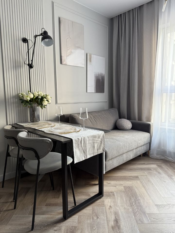 Квартира с новым дизайнерским ремонтом — в ней еще никто не жил! Удобная функциональная планировка: кухня-гостиная, отдельная уютная спальня, современная ванная комната с качественной сантехникой. Встроенная кухня, новая техника (посудомоечная и стиральная машина, холодильник, варочная панель, микроволновка), вместительные шкафы для хранения.