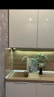 Кухня - сделана на заказ по размерам. Шкафы до потолка, что очень удобно для хранения.