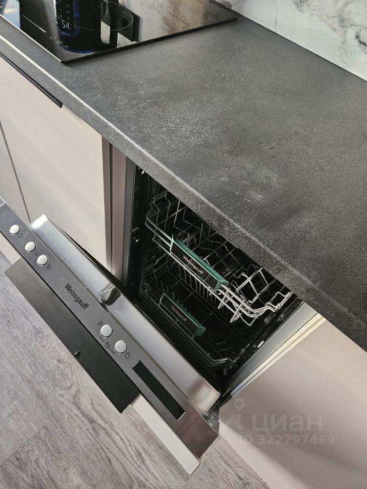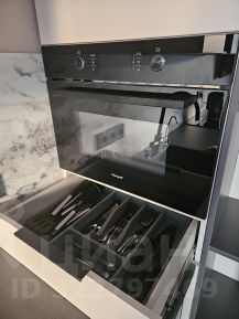 На кухне есть вся необходимая техника (чайник, варочная поверхность, вытяжка, посудомоечная машина, духовой шкаф с функцией СВЧ, встроенный холодильник) и посуда. Вмонтирован дополнительный фильтр питьевой воды.