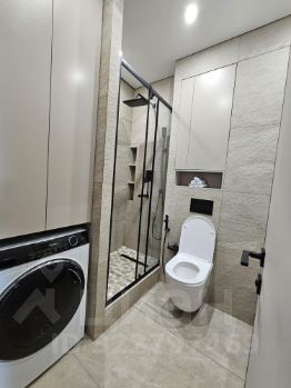 В санузле размещена стиральная машина с функцией сушки белья.