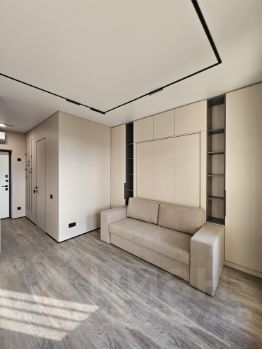 К вашему удобству оборудована полностью. Продумана система хранения: шкаф-купе в коридоре, шкаф-кровать с двумя шкафами и антресолями в комнате, 2 шкафа в санузле.