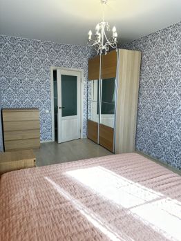 Комната 2: большая спальня с двуспальной кроватью (160х200) и ортопедическим матрасом, прикроватные тумбочки, комод и вместительный шкаф-купе. Есть спальные принадлежности (одеяло, подушки)