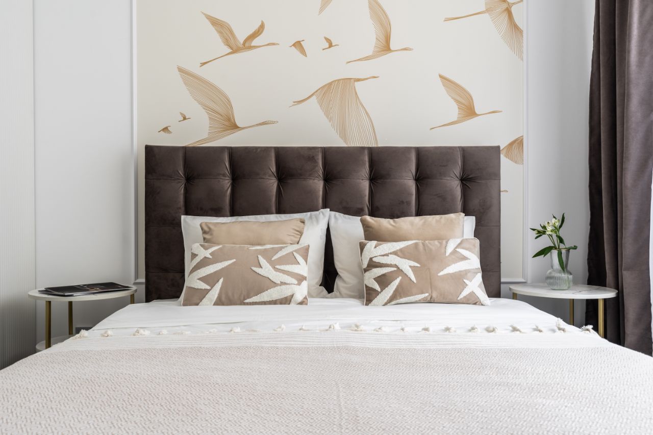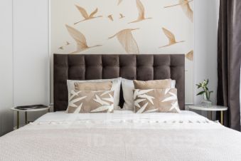 Просторная уютная спальня с большим окном, вместительный шкаф и большая кровать Аскона с ортопедическим матрасом, подушками и одеялом.