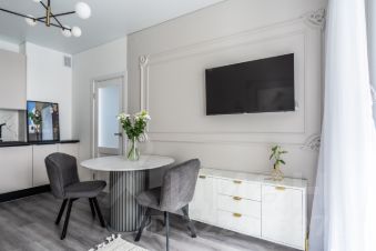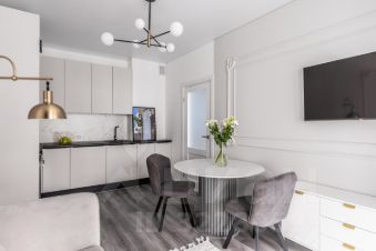 Кухонный гарнитур с множеством мест для хранения и всей необходимой техникой (в т.ч. посудомоечной машиной). Круглый стол со стульями и диваном для вашего удобства.