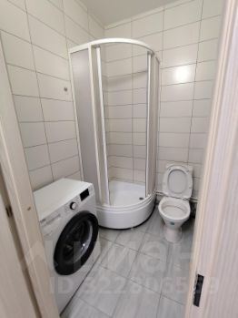 В санузле работает тёплый пол, есть душевая кабина, унитаз, стиральная машина, раковина с тумбой, зеркало.