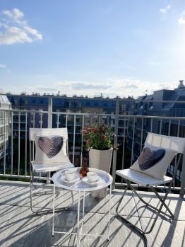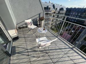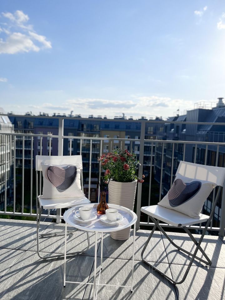 Шикарная огромная терраса придает квартире особый шарм для уютных посиделок на свежем воздухе с видом в тихий закрытый двор и на красивое небо и закат.