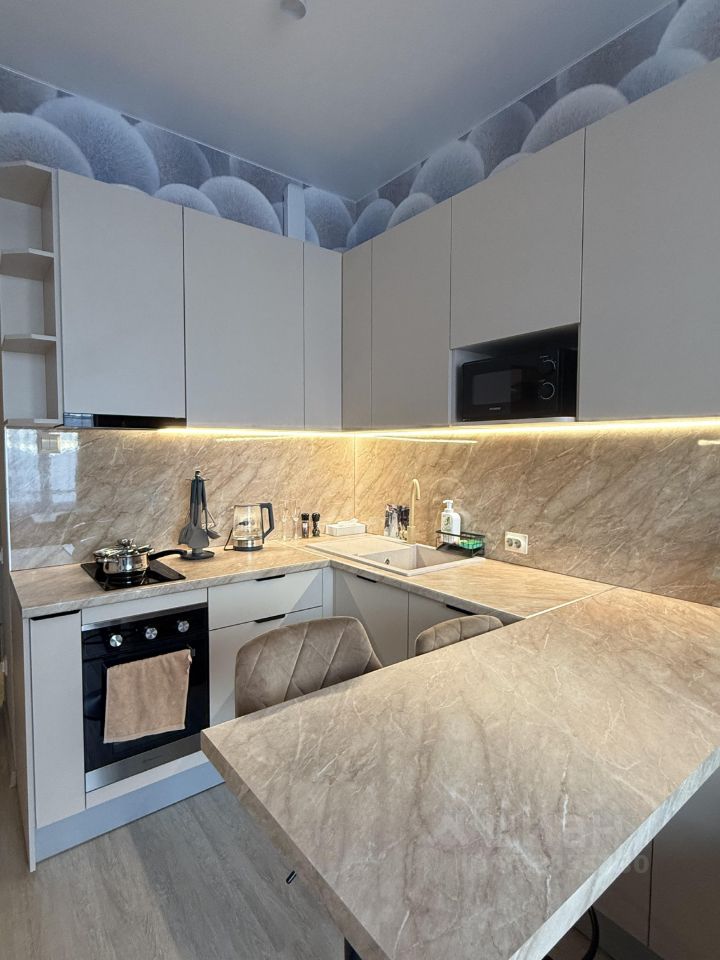 В квартире сделан качественный дизайнерский ремонт. Удобная планировка студии позволяет максимально использовать пространство. В кухне и комнате есть вся необходимая мебель. Совмещённый санузел оборудован душевой кабиной. Из техники в вашем распоряжении: холодильник, телевизор, стиральная машина, духовой шкаф и микроволновая печь . Также подключён интернет для комфортного проживания.