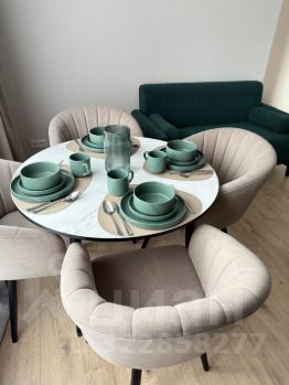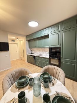 Просторная кухня-гостиная с кухонным гарнитуром, диваном, телевизором и всей необходимой техникой: духовой шкаф, микроволновая печь, варочная панель, холодильник, чайник, вытяжка, посудомоечная машина. Также имеется набор посуды для приготовления Tefal, комплект столовой посуды и приборов.