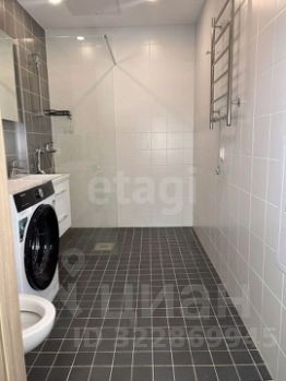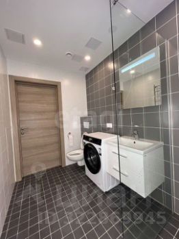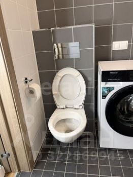 Ванная комната с современной сантехникой, душевой кабиной, инсталляцией, стиральной машиной и подогревом пола.