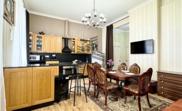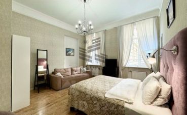 Квартира располагается на 2-м этаже 7-этажного дома (есть лифт), окна выходят в тихий двор. Три спальни: в каждой установлена двуспальная кровать и раскладывающийся диван. В кухне-гостиной также есть раскладывающийся диван, который при необходимости может стать дополнительным спальным местом. Два санузла: один с ванной и туалетом, второй с душем и туалетом. Подходит для размещения до 14-16 человек.