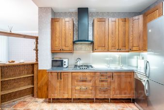 Полностью оборудованная кухня с газовой плитой, вытяжкой, посудомоечной машиной, электрическими чайником, вместительным холодильником, стильной посудой для приготовления пищи и сервировки стола.