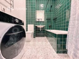 - Совмещённый санузел (ванна, раковина, полотенцесушитель, стиральная машина, этажерка, гримерное зеркало с лампами).