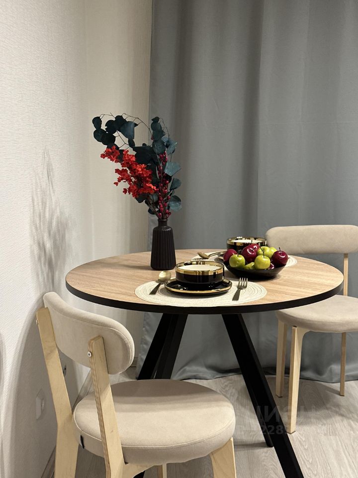 На кухне функциональный кухонный гарнитур, вытяжка, варочная панель, духовой шкаф, микроволновая печь, холодильник, обеденный стол со стульями и диван.