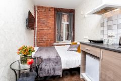 В кухонном уголке можно приготовить лёгкие блюда, а также разогреть блюда из близлежащих ресторанов и кафе, ну и конечно же попить чай/кофе.