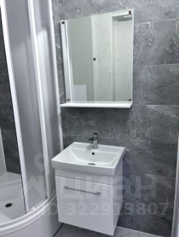 В санузле есть душевая кабина и раковина с тумбой, унитаз. Теплый пол.
