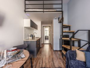 Площадь студии составляет 18 м² + 4 м² второго яруса, который является спальным местом. Возможное размещение: от 1 человека до компании из 4 человек.