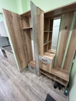 Есть рабочий стол. В прихожей большой вместительный шкаф с отличным наполнением( штанга для верхней одежды, обувница, полочки и ящики).