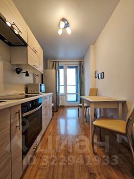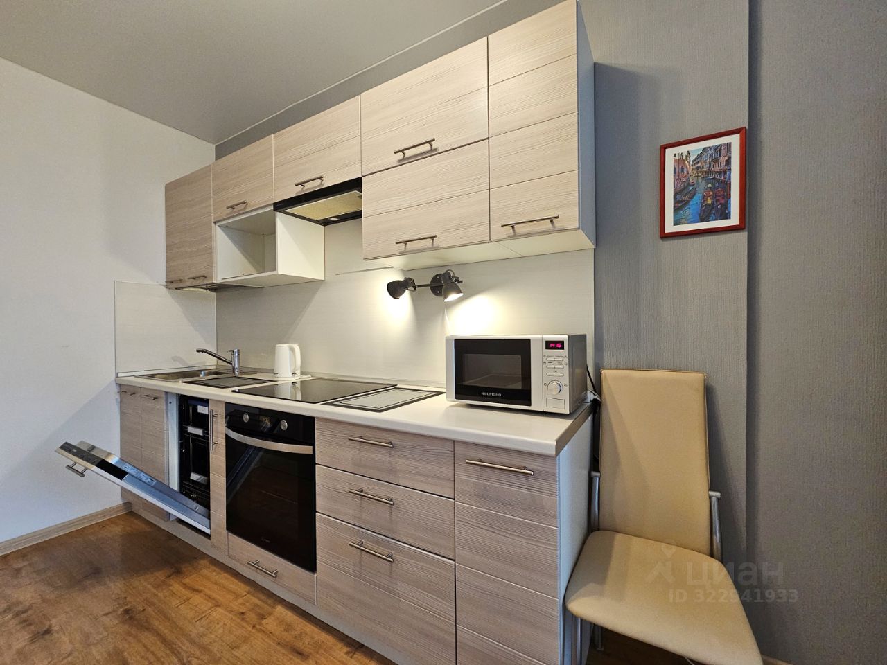 На кухне установлен гарнитур укомплектованный встроенной бытовой техникой: посудомоечной машиной, варочной поверхностью, духовым шкафом, вытяжкой. Имеется двухкамерный холодильник, микроволновая печь, чайник. Стол, стулья. Выход на лоджию из кухни.