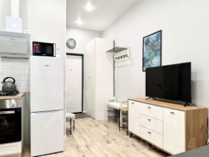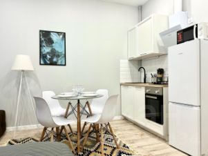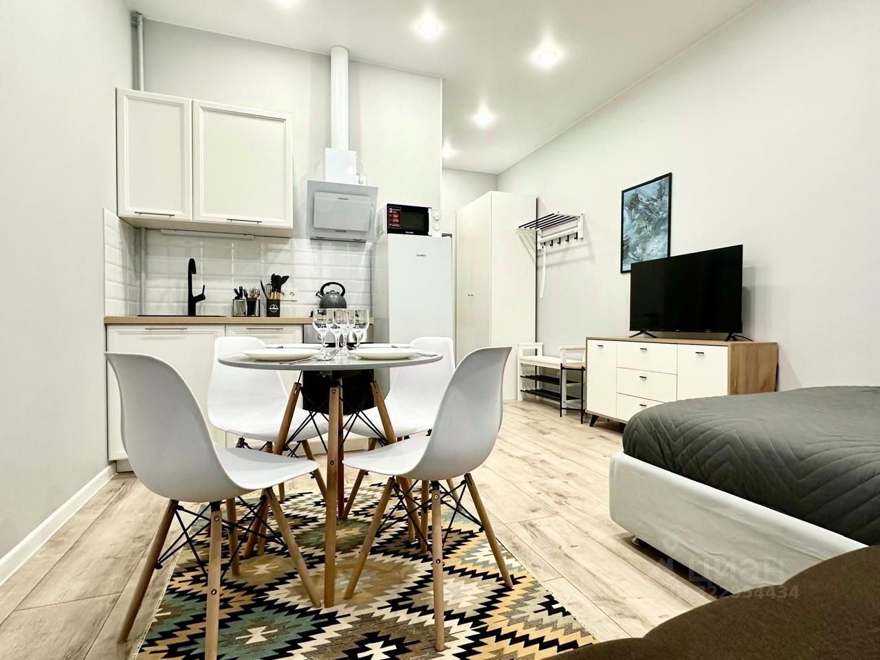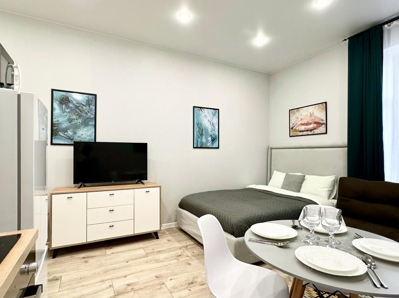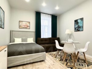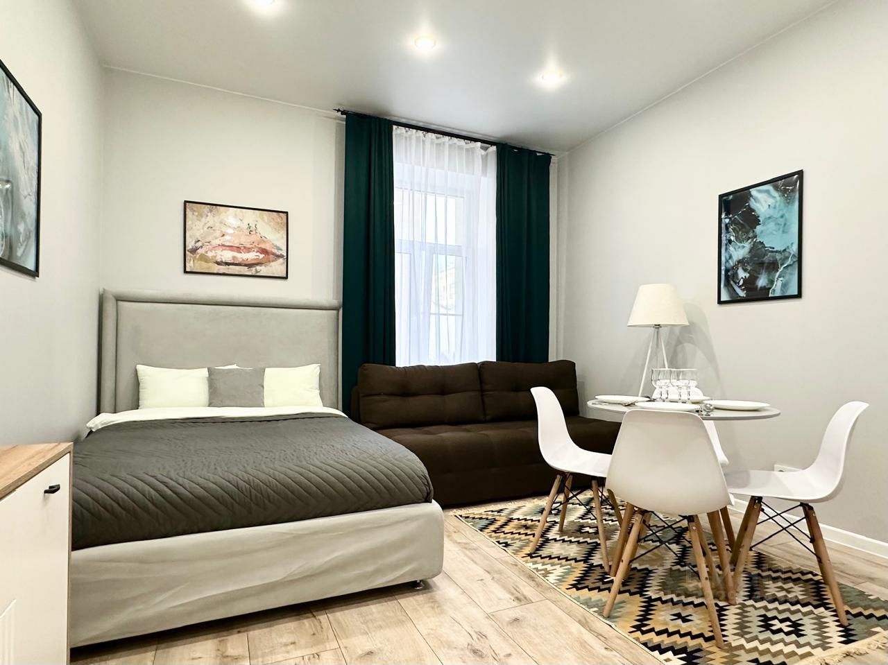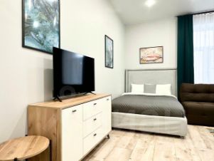 Комфортная современная студия отлично подойдет для проживания до 4 человек: установлены двуспальная кровать и двуспальный раскладывающийся диван. Постельное бельё готовится из расчета 2+2 (два двуспальных комплекта).