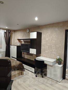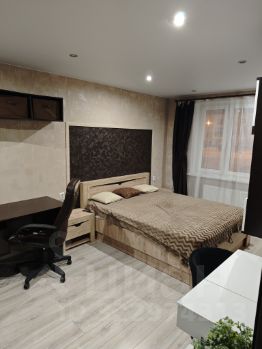 В спальне есть кровать, прикроватные тумбочки, стеллаж, "стенка" под телевизор, сам телевизор, оснащенный системой Яндекса "Алиса", стол компьютерный и столик с зеркалом для макияжа с небольшим комодом