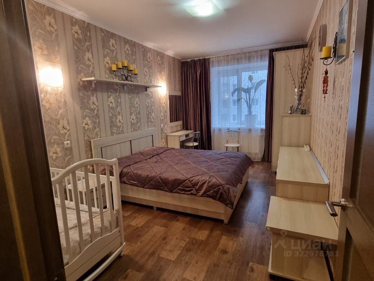 В спальне расположена 2спальная кровать для комфортного сна, также есть необходимая мебель и встроенный шкаф.