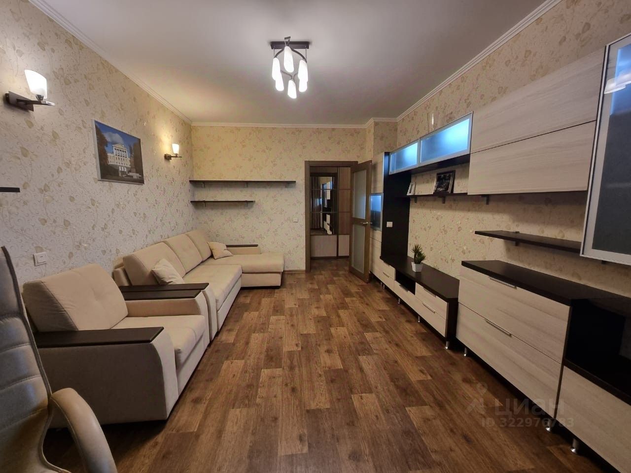В гостиной удобный диван, вместительный шкаф, компьютерный стол и тумба под TV.