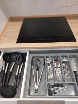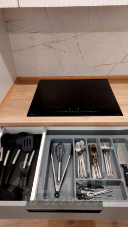 Кухня обустроенна всей необходимой техникой, мебелью и кухонными пренадлежностями.