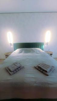 В комнате большая удобная кровать с ортопедическим матрасом, свежее хлопковое постельное бельё.