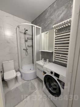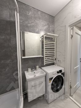 В ванной комнате есть электрический полотенцесушитель, стиральная машина, шкафчик, швабра с отжимом и ведро для мытья полов, контейнер для грязного белья, мусорное ведро с сенсором.