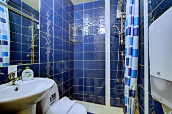 В ванной комнате, оборудованной обогреваемым полом, находится раковина, душ и туалет.