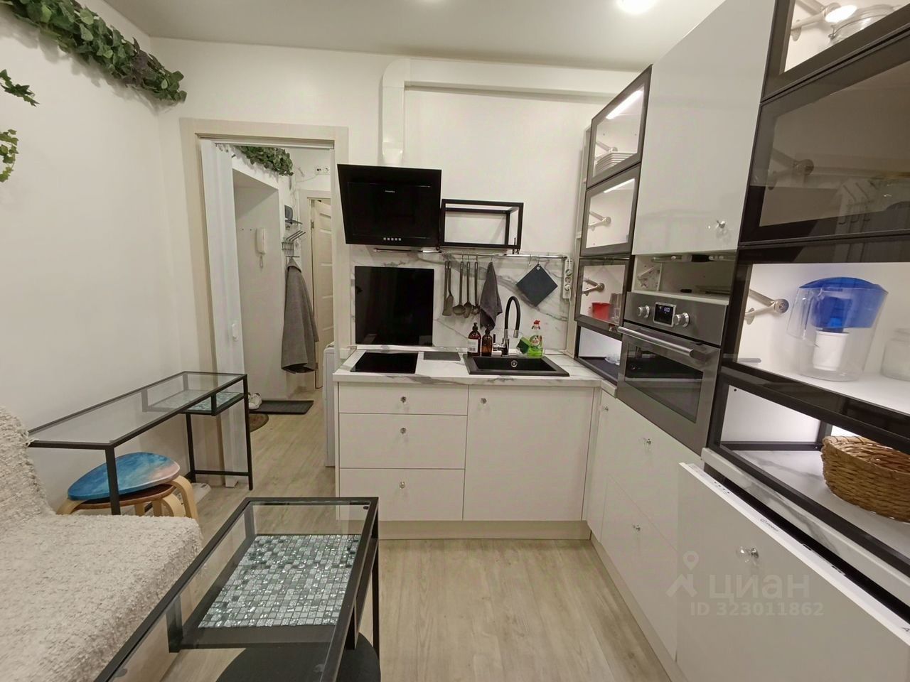 Кухня светлая и уютная. В ней есть необходимая мебель, холодильник, варочная панель, вытяжка, духовой шкаф, микроволновая печь, посудомоечная машина, электрический чайник и капсульная кофемашина. Вся посуда и столовые приборы в комплекте. Также установлены стиральная машина и водонагреватель.