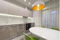 На кухне установлен современный кухонный гарнитур со встраиваемой бытовой техникой: холодильник, посудомоечная машинка, духовой шкаф и варочная панель. Стол раскладывается, можно увеличить при необходимости.