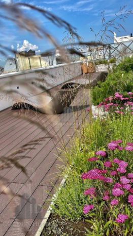 На крыше дома оборудована терраса, откуда можно любоваться восхитительными видами на город, салютами в дни праздников или просто позагорать в жаркий солнечный денек.