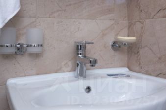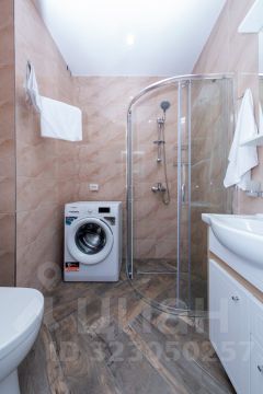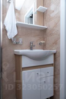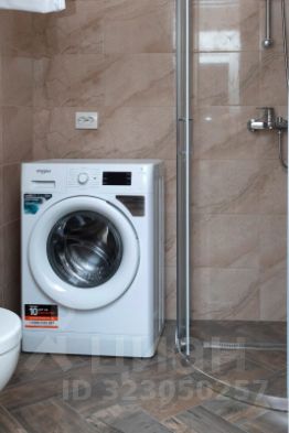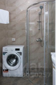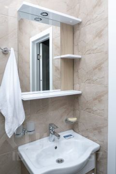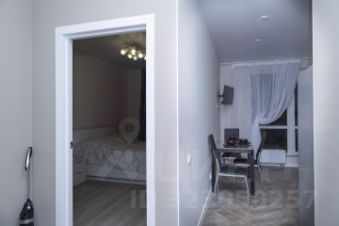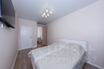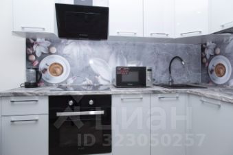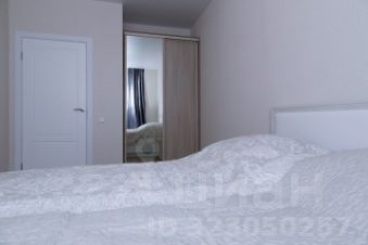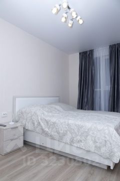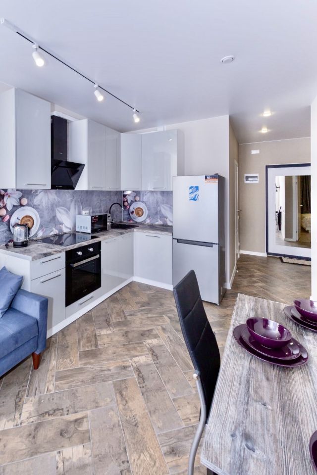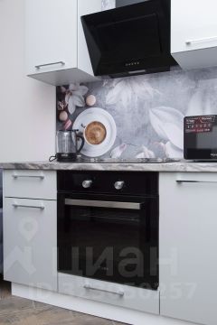 В спальне кровать с подъёмным механизмом, ортопедический матрас, тумбы, шкаф-купе, телевизор, холодильник, чайник и микроволновая печь, минимальный набор посуды. Встроенная варочная панель, духовой шкаф и вытяжка, всё в одной цветовой гамме.