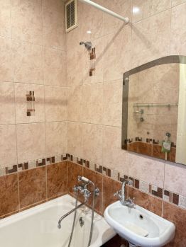 Комната разделена перегородкой. Два раскладных дивана, 4 спальных места. На кухне также есть вся необходимая техника: микроволновка,газовая плита, холодильник. Покупка необходимой мебели/ техники обговаривается, возможна в счет аренды. Санузел совмещенный, оборудован ванной. Окна выходят во двор, поэтому в квартире всегда светло. Высота потолков составляет 2.8 метра, что создает ощущение простора.