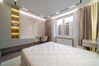 Каждая деталь как часть целостной дизайнерской идеи. Стеновые панели, молдинги, контурная подсветка, кровать с ортопедическим матрасом, туалетный столик с зеркалом в потолок, рабочая зона.