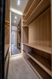 Отдельная гардеробная с зеркалом в потолок — организованное хранение без компромиссов: от обуви до аксессуаров, всё аккуратно и по системе.