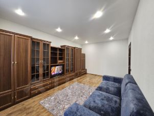 В гостиной новый диван (раскладывается в удобное спальное место), корпусная мебель, ЖК телевизор. Выход на застекленную лоджию.