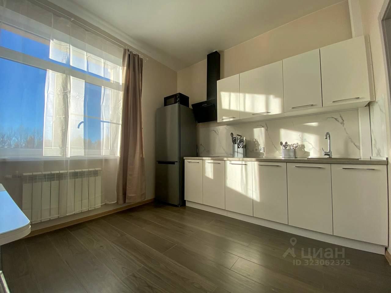 • Просторная кухня с большим окном, новая мебель и техника: холодильник, варочная панель, микроволновая печь, чайник, вытяжка, посуда.