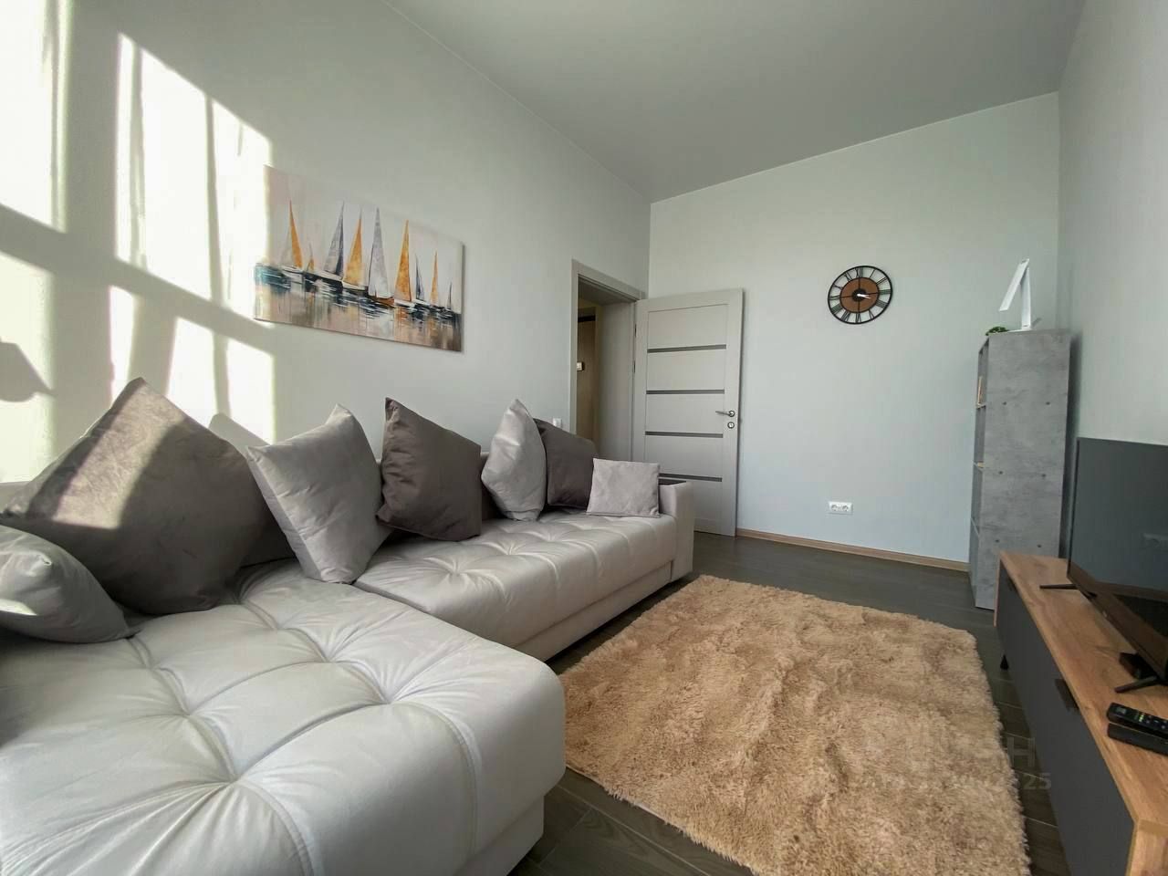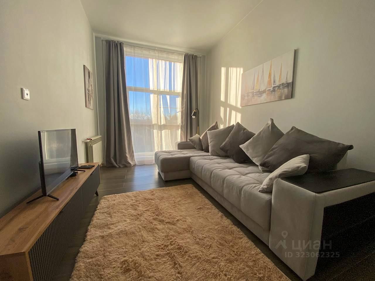 • Гостиная с панорамным окном и большим ,удобным диваном, телевизором и мягким ковром.