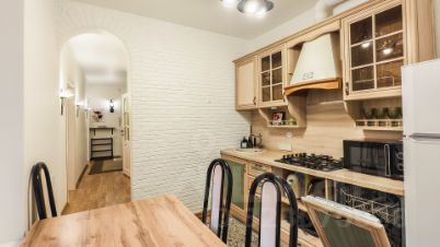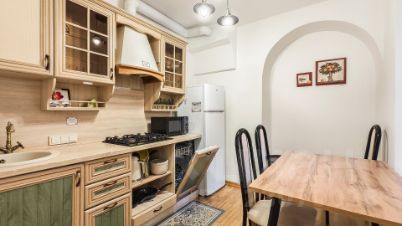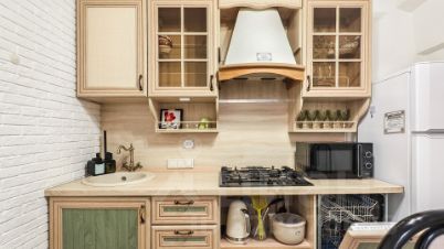 В кухне есть всё необходимое для быта, включая посудомойку и СВЧ-печь.