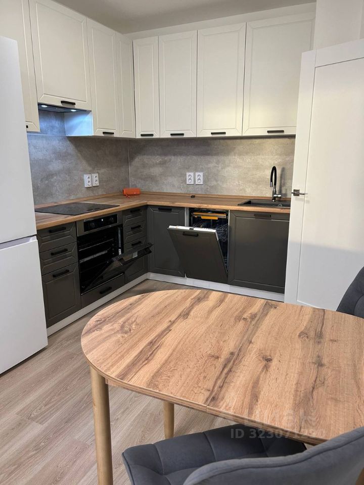 Полная новая мебель и техника: кровать с матрасом средней жесткости Аскона, кухонный гарнитур, индукционная варочная панель, духовой шкаф, вытяжка, холодильник, стиральная машина, посудомоечная машина, шкаф, стол, стулья, диван.