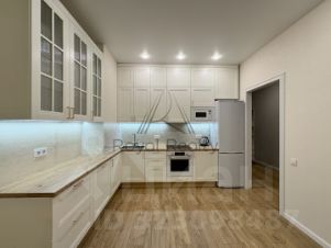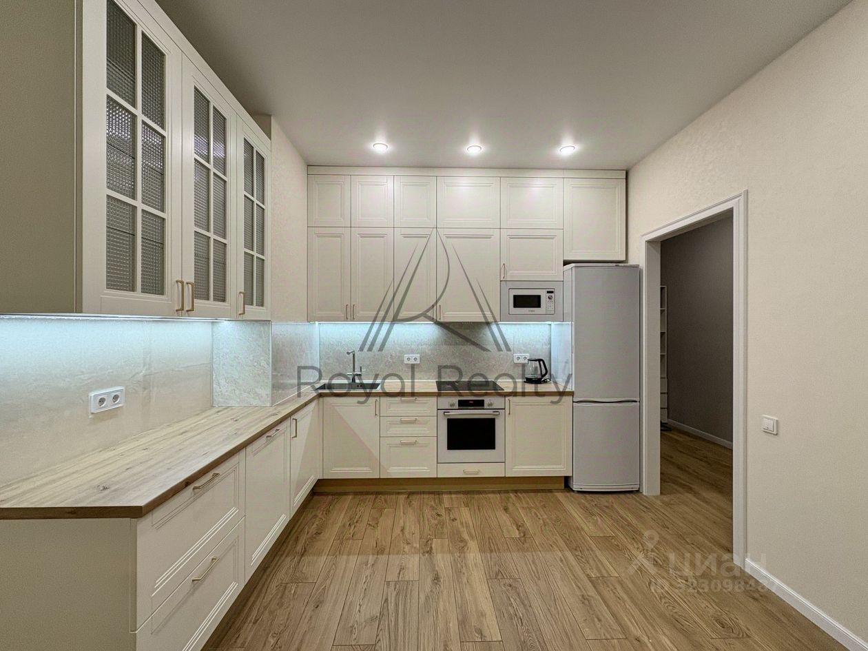 Кухня полностью укомплектована: встроенная техника (духовой шкаф, варочная панель, микроволновая печь, холодильник), лаконичный дизайн и функциональное пространство с большим количеством мест для хранения.