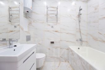 Качественная ванная с импортным санитарно-техническим оборудованием, раковина с настенным зеркалом и подсветкой, полотенцесушитель, места для хранения бытовой химии и банных принадлежностей.