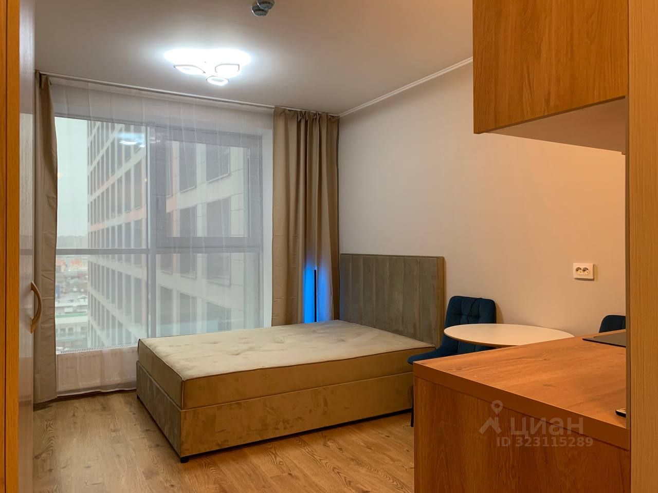 Есть все необходимое для комфортного проживания: полный кухонный гарнитур, электро-плита, СВЧ-печь, обеденный стол, большая двуспальная кровать. В студии большие панорамные окна c видом на улицу.